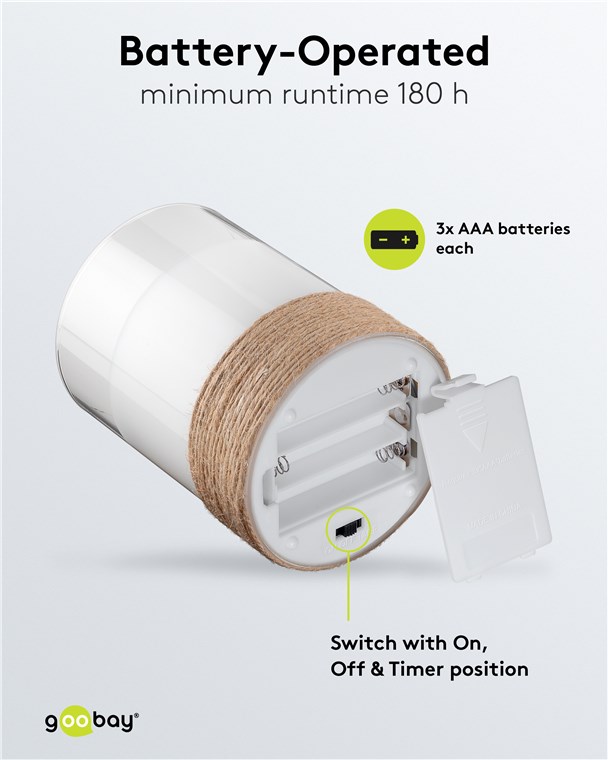 - Dimensions (H x Ø): 10 x 7.5 cm, 12.5 x 7.5 cm, 15 x 7.5 cm, each LED candle is powered by 3x AAA batteries (not included)