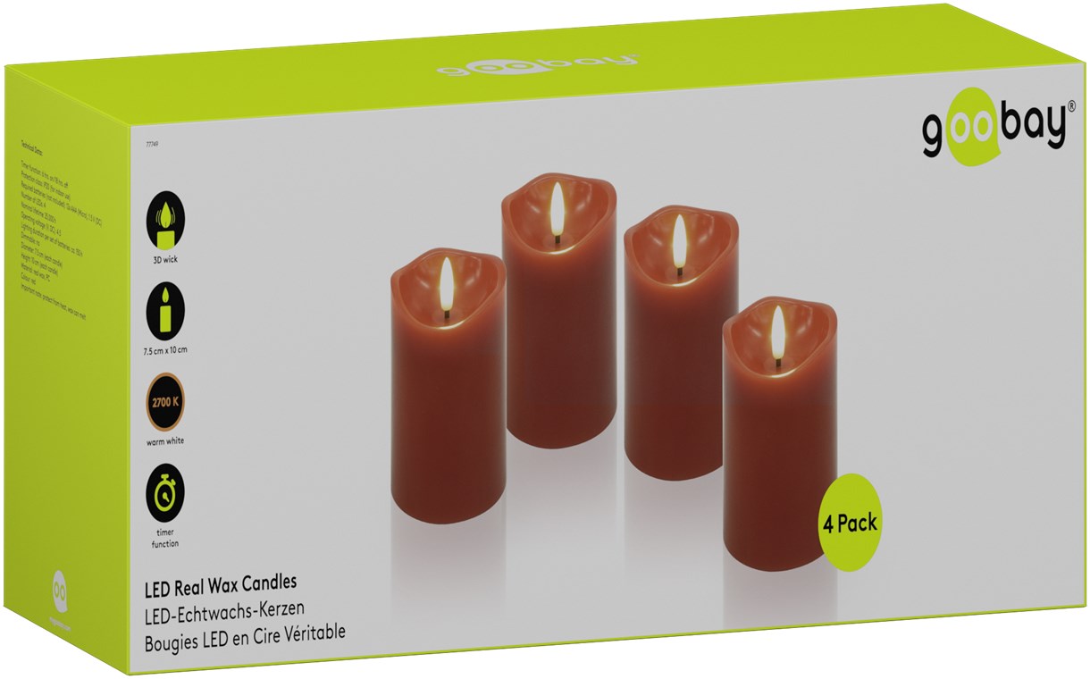 - Four equally sized pillar candles with 3D flame heads for warm candlelight with a natural-looking, flickering flame – completely electric and completely safe