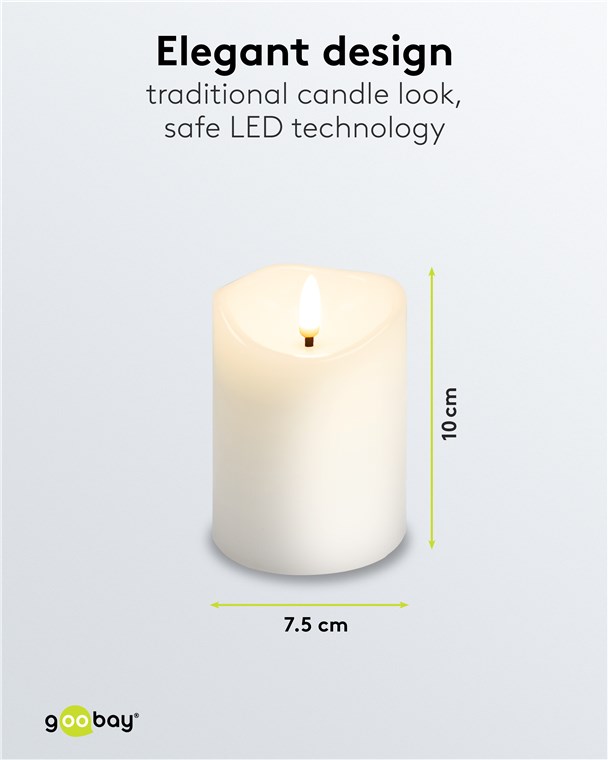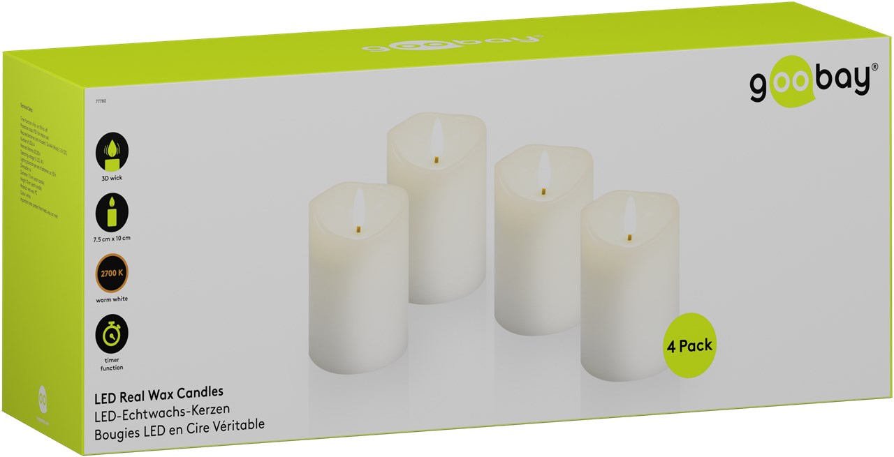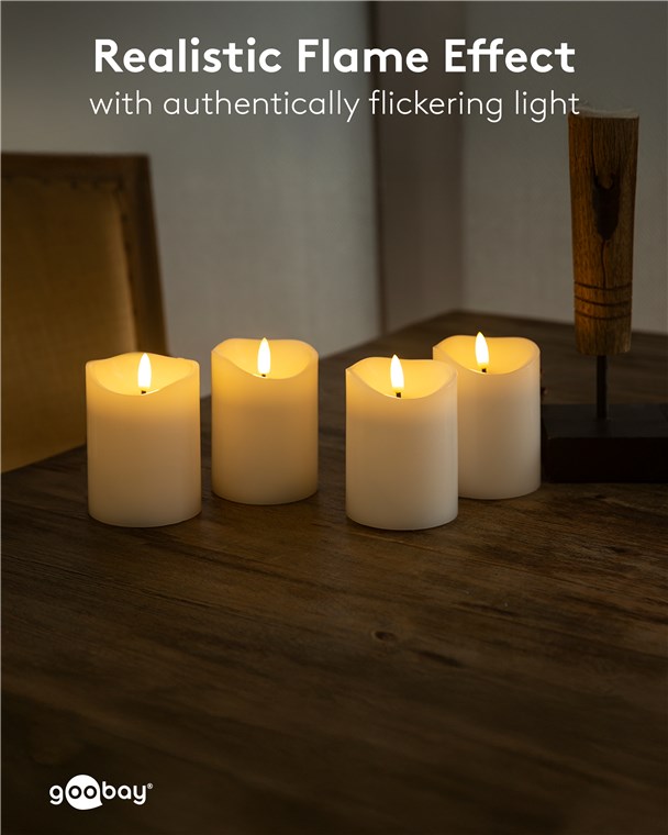 - Four equally sized pillar candles with 3D flame heads for warm candlelight with a natural-looking, flickering flame – completely electric and completely safe