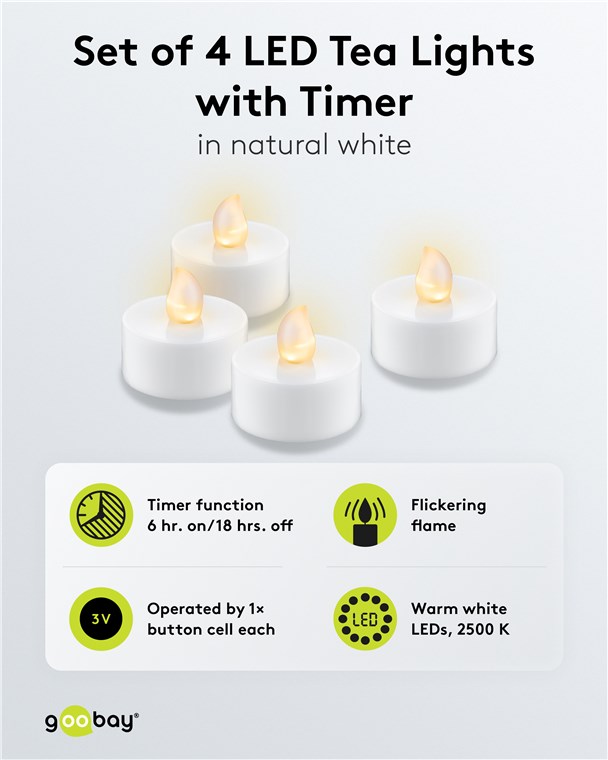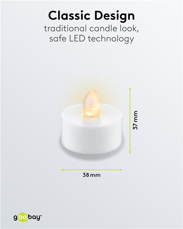- Classic tealights for warm candlelight with a naturally flickering flame – completely electric and completely safe