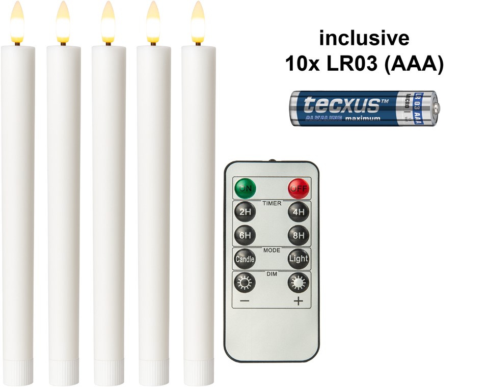 Set of 5 White LED Real Wax Rod Candles, incl. Remote Control and 10x AA (LR6)