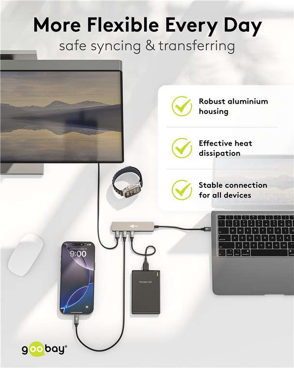 • Compatible with all standard USB devices, e.g. smartphones, keyboards, mice, webcams, hard drives (SSD, HDD) or headsets – without the need to install separate drivers