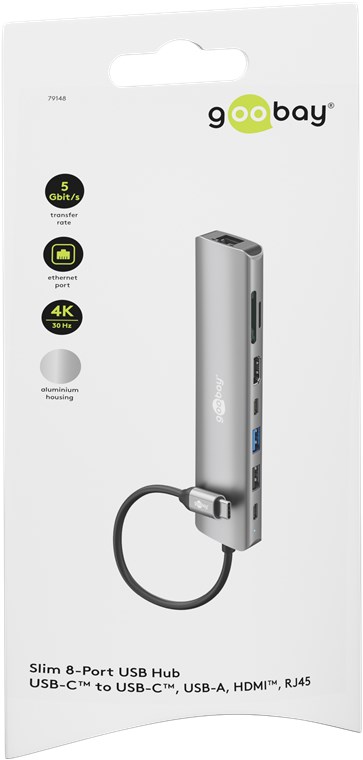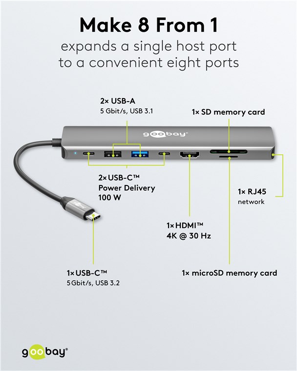 • The handy USB-C™ hub expands one device port to eight connections: As a result, a single tablet or laptop port serves up to eight peripheral devices