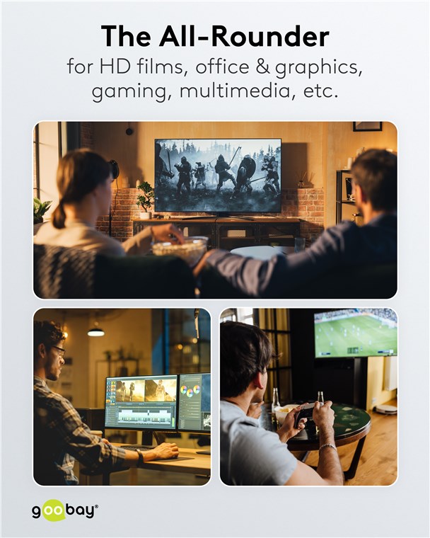 The DisplayPort™ cable impresses with three benefits: Ultra-slim cable, ultra-short connectors and ultra-narrow bending radius. These three factors make the cable perfect for installation on the back of devices and wherever space is limited. With ultra-high 8K image resolution for razor-sharp images and high-frequency multi-monitor function, the DisplayPort™ cable is the perfect choice for immersive gaming and captivating home entertainment experiences.