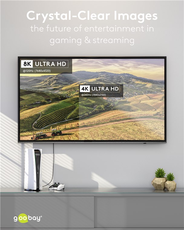 - 8K DisplayPort™ cable especially for gaming. Smooth images without judder thanks to high refresh rates of up to 240 Hz (depending on graphics card and monitor)
