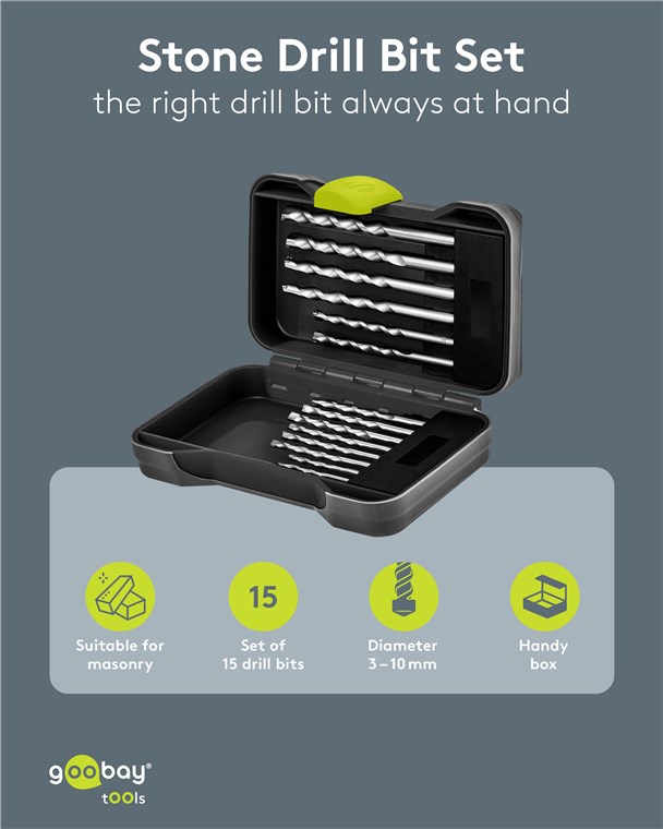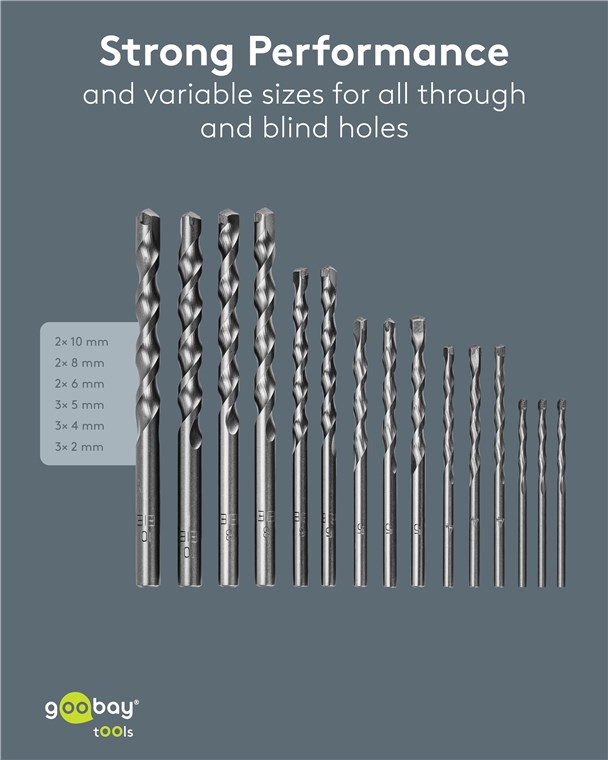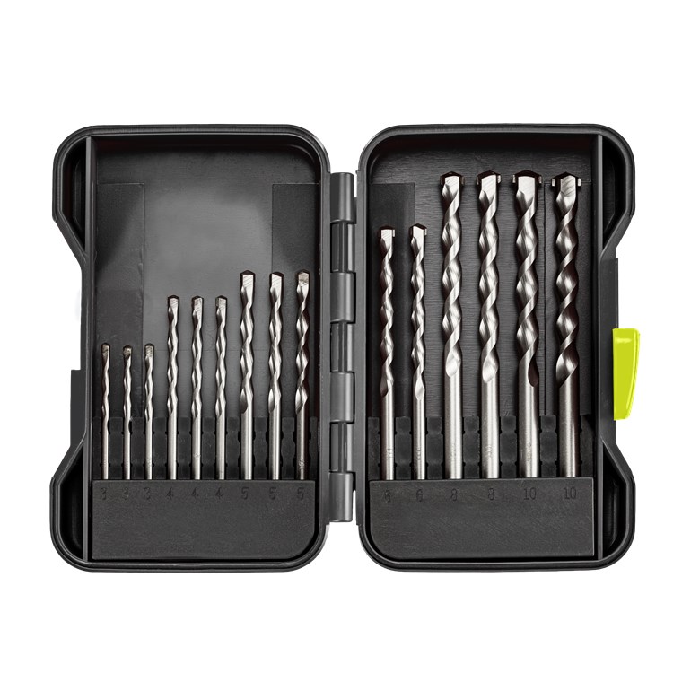 15 masonry drill bits (2× 10 mm / 2× 8 mm / 2× 6 mm / 3× 5 mm / 3× 4 mm / 3× 2 mm), storage box