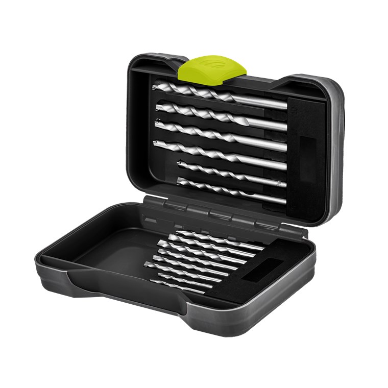Knock on wood: The drill bit set is your reliable helper for assembly work and repairs, e.g. on walls. The centring tip ensures precisely drilled holes without drifting. With the individually marked slots in the box, the right drill bit is always at hand.