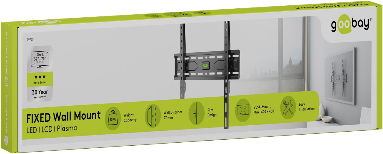 - Extra-flat TV mount for particularly space-saving wall mounting with only 2.7 cm wall clearance