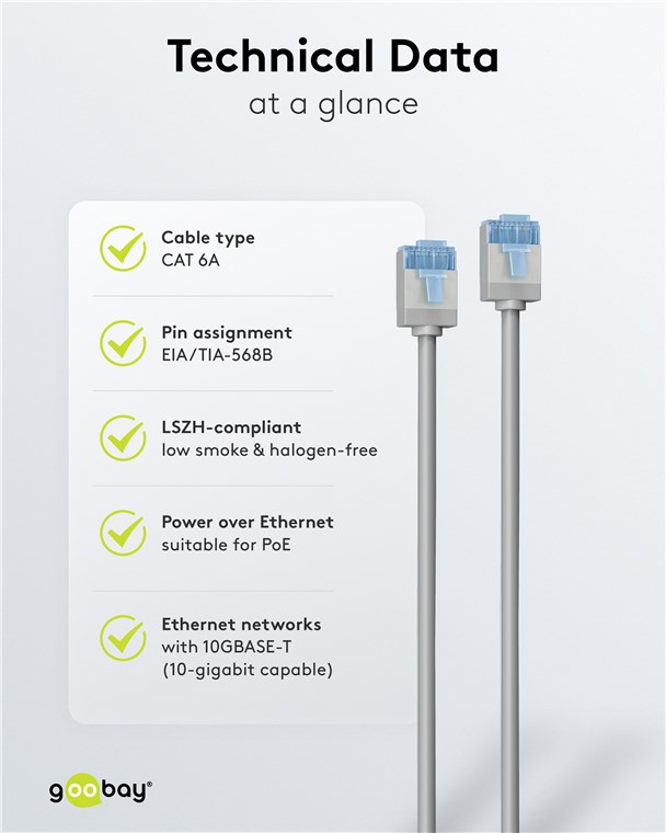 - Super-thin LAN cable with extra-short RJ45 connectors for a reduced cable volume in the server cabinet or patch panel, resulting in optimised air circulation