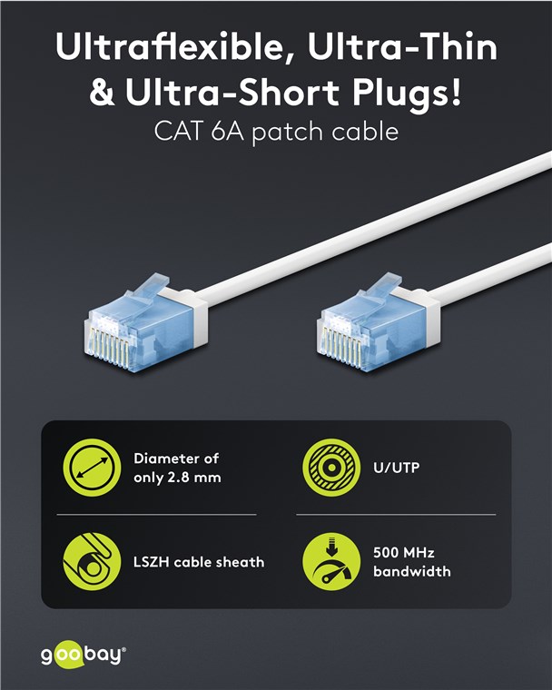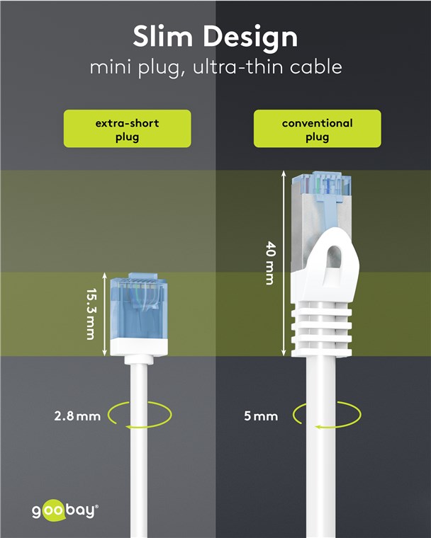 A CATegory of its own: The super-slim CAT cables with extra-short connectors drastically reduce the volume of material in server cabinets and patch panels - for significantly improved air circulation and less heat build-up than with conventional cabling. In addition, the soft TPE jacket and slim copper conductors provide the special flexibility and material efficiency that make this cable generation the perfect network partner.