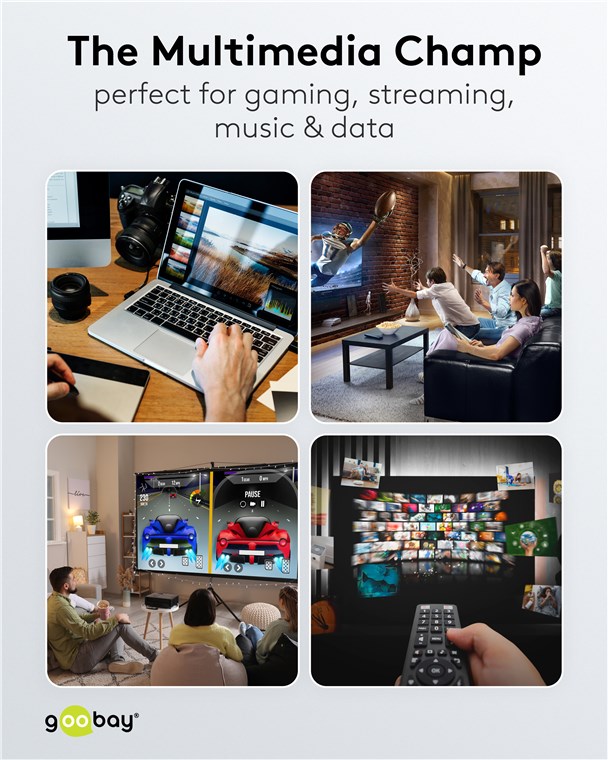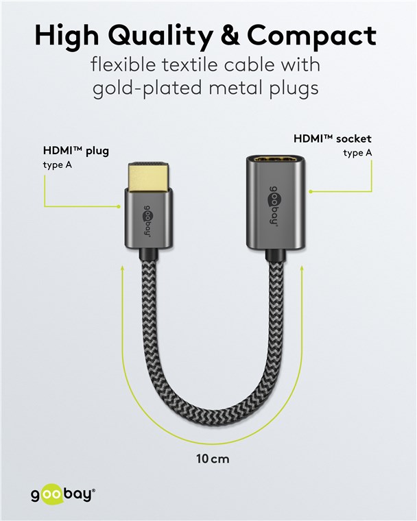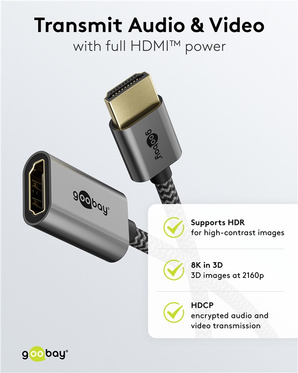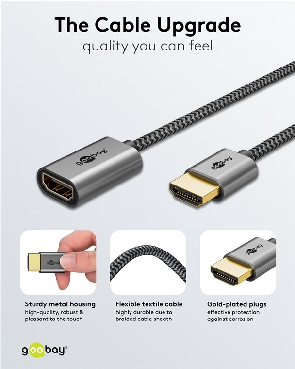 The Goobay Plus Series comes in a slim, elegant metal design in Sharkskin Grey. The state-of-the-art HDMI™ cable achieves top values in terms of resolution and transmission speed and is also ideally suited even for demanding functions such as ARC, HDR and 3D content.