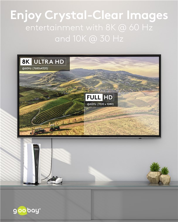 - The HDMI™ cable achieves crisp UHD resolutions of up to 8K @ 60 Hz and 4K @ 120 Hz (backwards compatible)