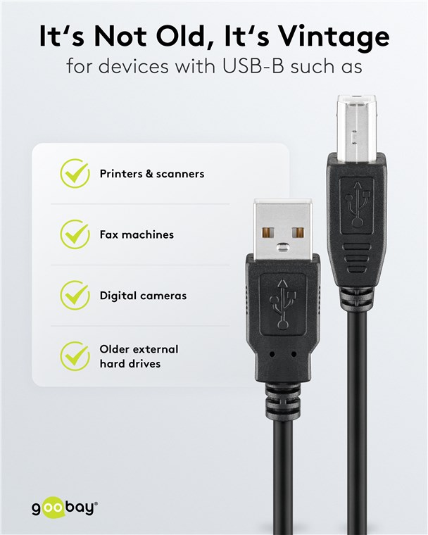 • Data cable for connecting a laptop or PC output (USB-A) to USB-B devices such as printers, scanners, fax machines or external hard drives