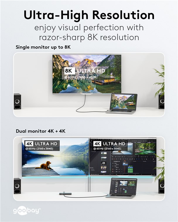 - The cable supports ultra-high resolutions of up to 8K @ 60 Hz/4K @ 120 Hz on single monitors and 4K @ 60 Hz when the signal is split between two monitors via a hub