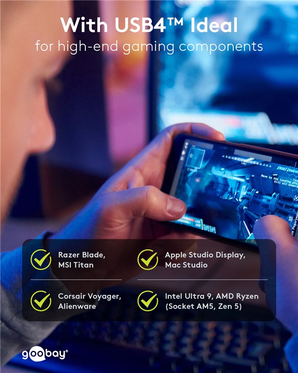 - USB4™ is compatible with high-end gaming components, e.g. the Razer Blade 18, Corsair Voyager, Apple Studio Display or AMD Ryzen processors (Zen 3+, Zen 5)
