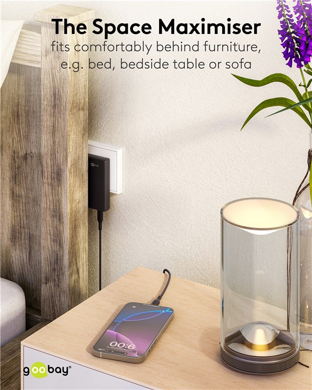 - When connected to the power outlet, the USB-C™ charger is barely thicker than a skirting board and therefore extremely space-saving – ideal for confined spaces, e.g. behind bedside tables and other furniture