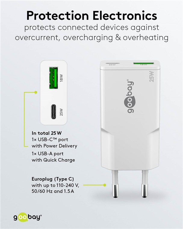 - The integrated protection electronics of the phone charger protects connected devices against overcurrent, overcharging and overheating