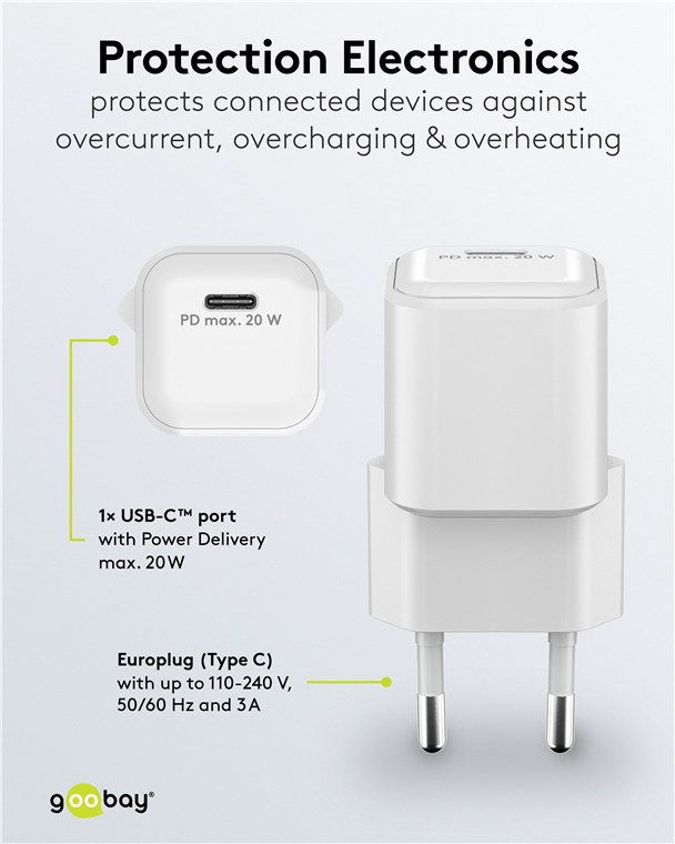 - The integrated protection electronics of the USB-C™ charger protects connected devices against overcurrent, overcharging and overheating