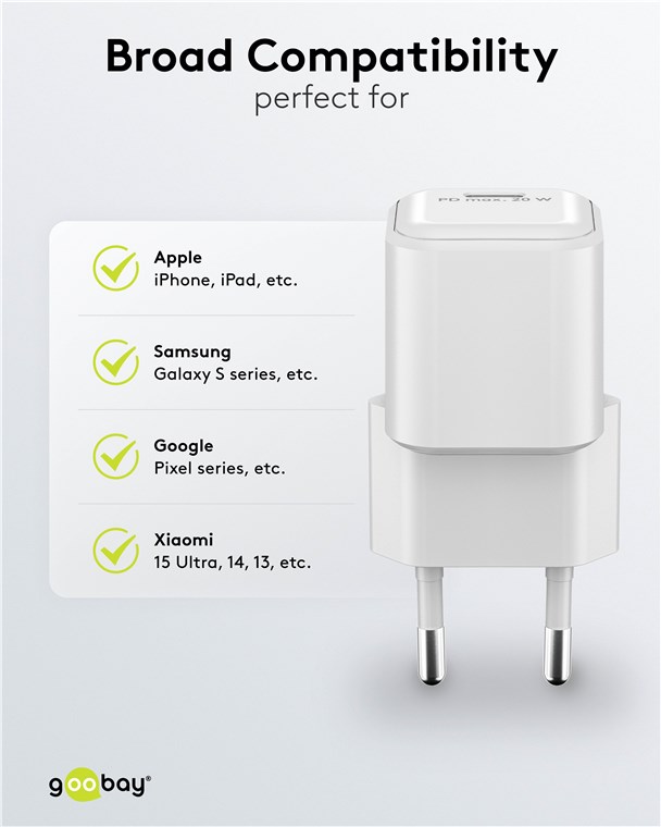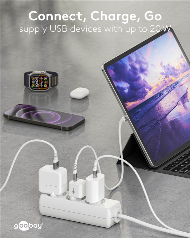 - With 20 W of power, the charging adapter is specially tailored to small devices such as smartphones, Bluetooth headphones, tablets or power banks