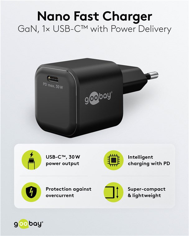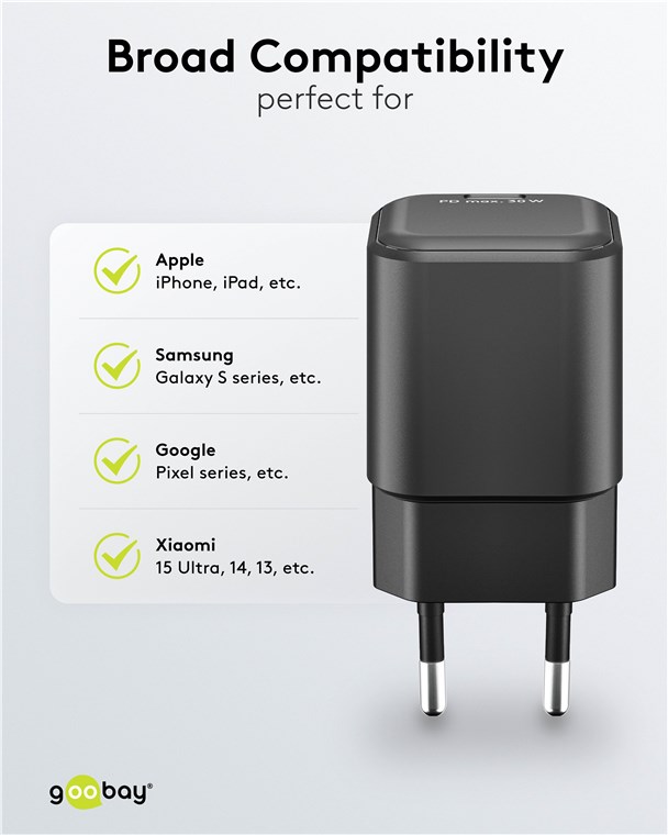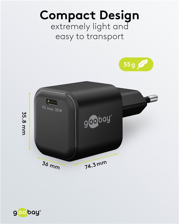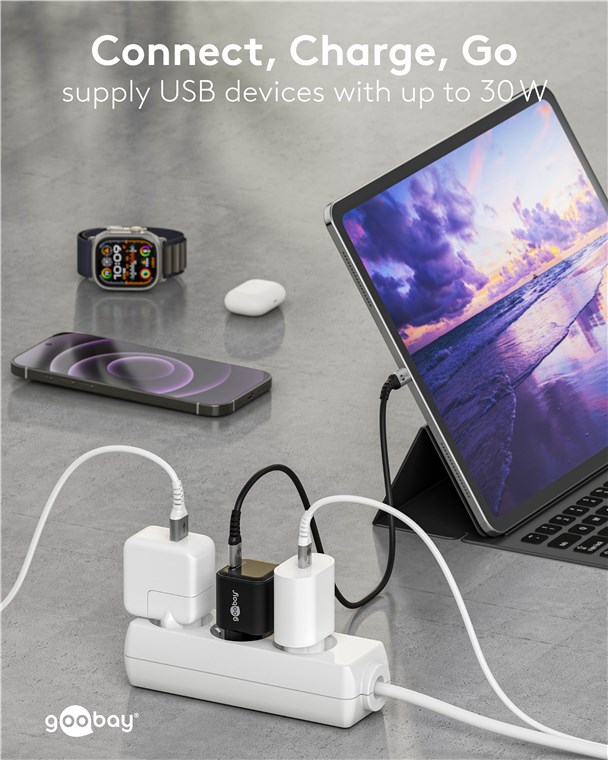 - With 30 W of power, the charging adapter is specially tailored to small devices such as smartphones, Bluetooth headphones, tablets or power banks