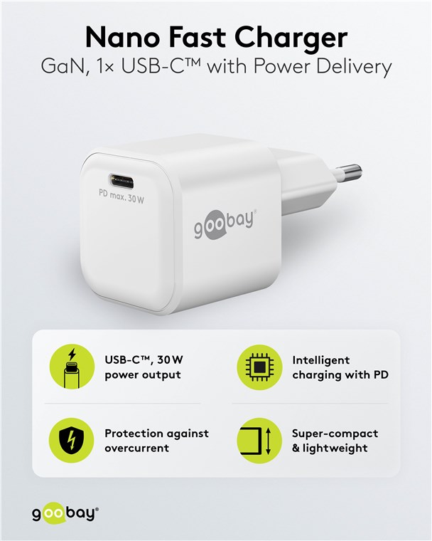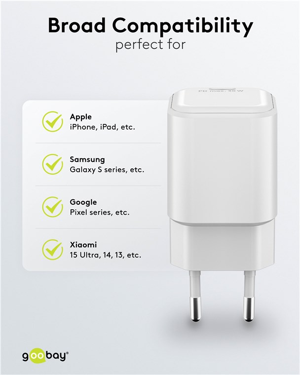 - With 30 W of power, the charging adapter is specially tailored to small devices such as smartphones, Bluetooth headphones, tablets or power banks