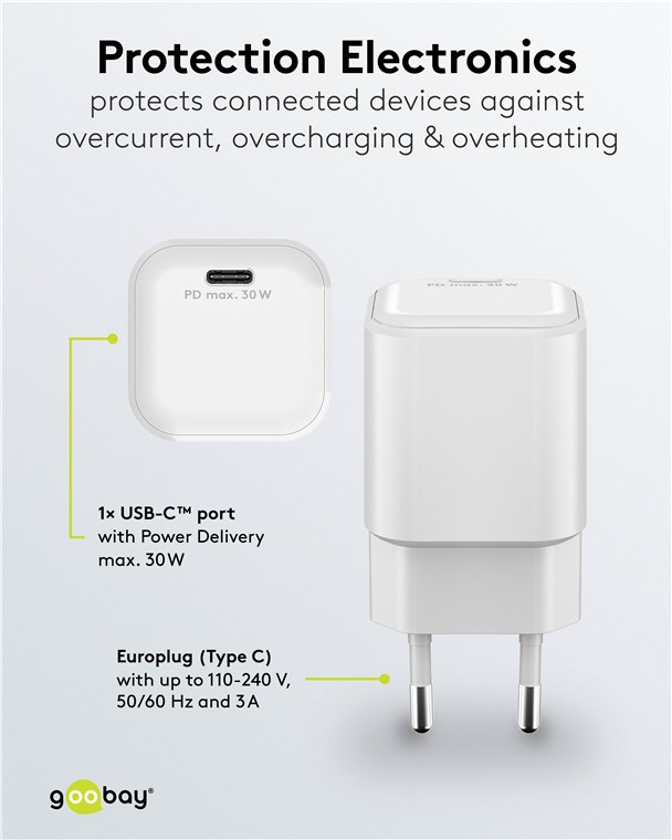 - The integrated protection electronics of the USB-C™ charger protects connected devices against overcurrent, overcharging and overheating