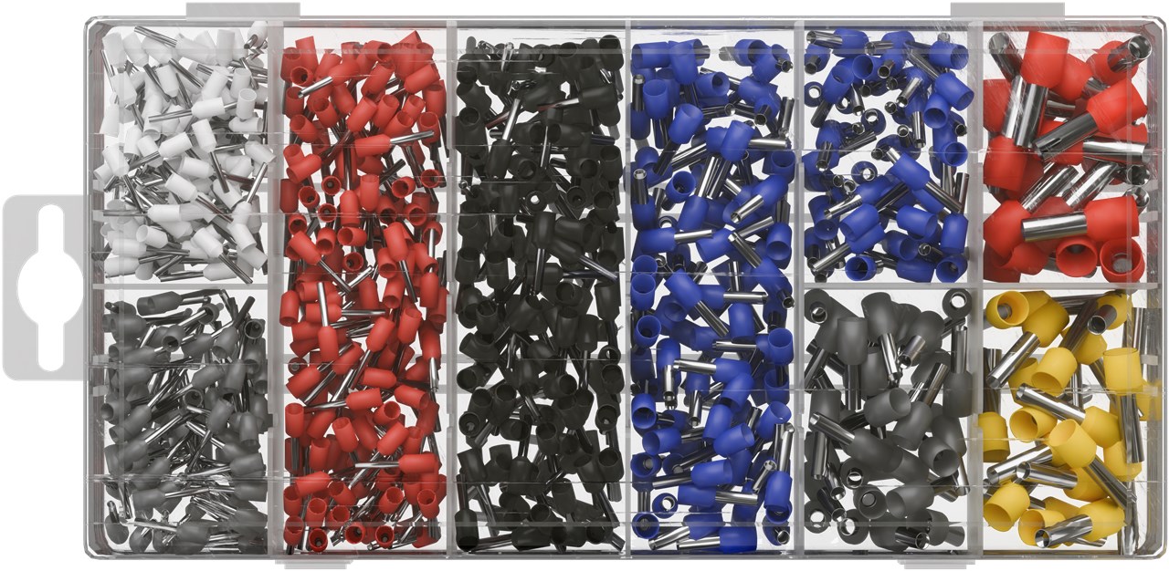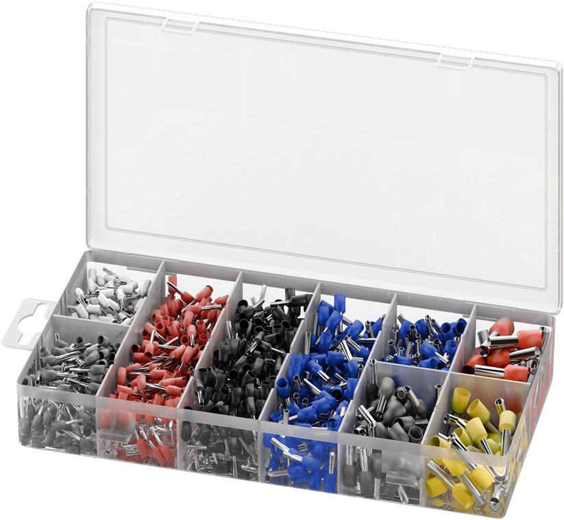- Insulated end sleeves: 200x E0508/white, 200x E7508/grey, 200x E1008/red, 250x E1508/black, 250x E2508/blue, 50x E4009/grey, 25x E6012/yellow, 25x E10-12/red