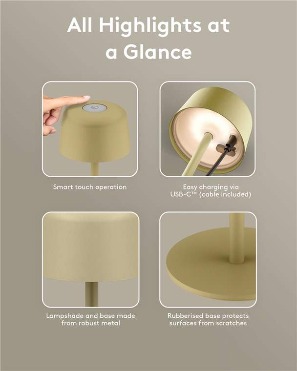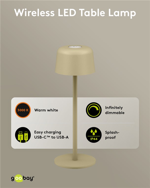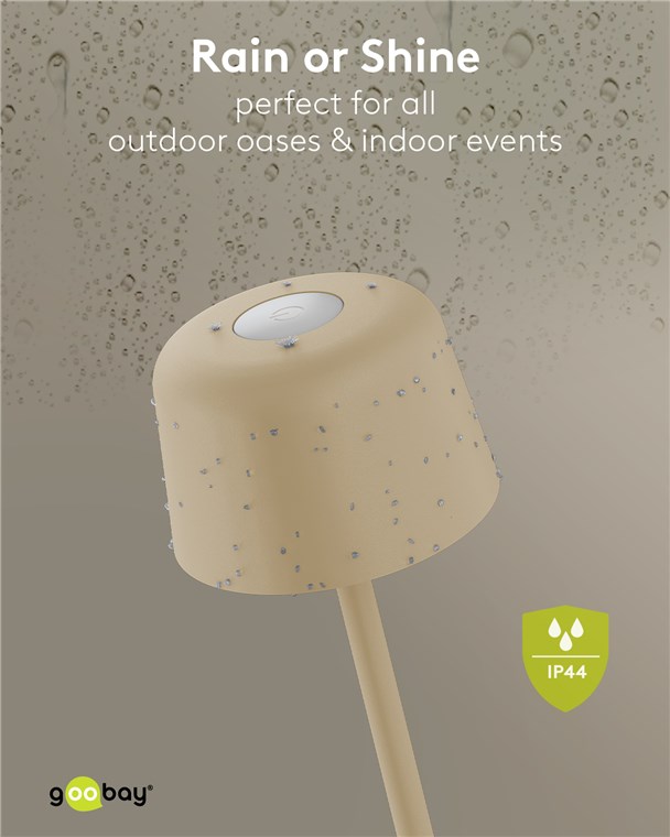 - Thanks to its splash water protection (protection class IP44), the table lamp is also perfect for the patio, balcony or garden