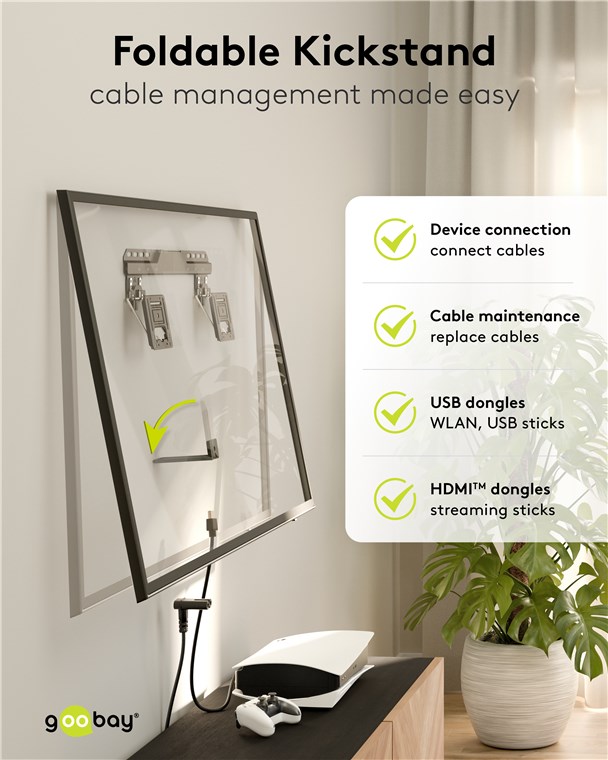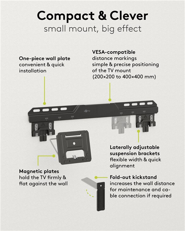 - Support TV ultraplat avec une distance au mur de seulement 9 mm, grâce auquel l'appareil affleure presque le mur et ne dépasse pas dans la pièce