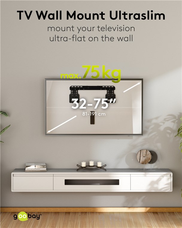 Une technologie invisible, un divertissement à couper le souffle : Le support mural ultraplat met en valeur ton téléviseur slim et lui donne toute l'attention qu'il mérite. Avec une distance au mur extrêmement réduite et une limite de charge de 75 kg, tu peux mettre en scène même les téléviseurs les plus lourds de manière efficace et ultraplate. Maintien sûr et lignes épurées pour un look moderne.