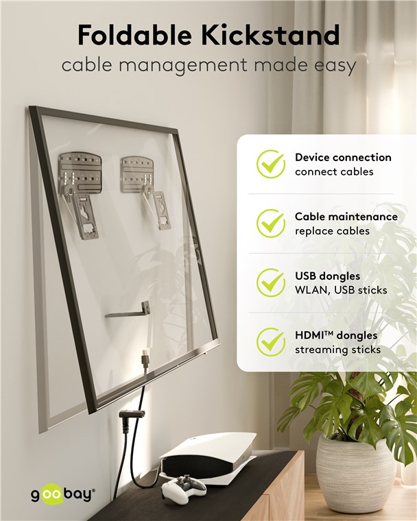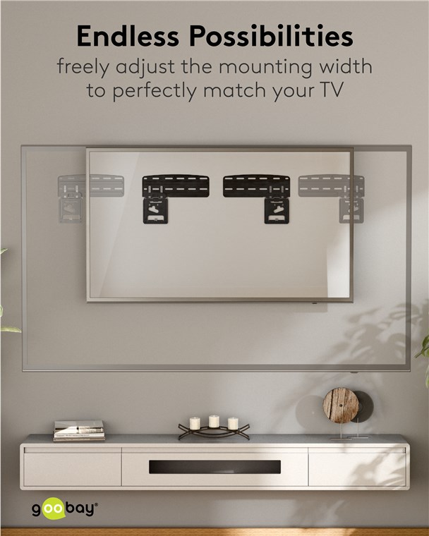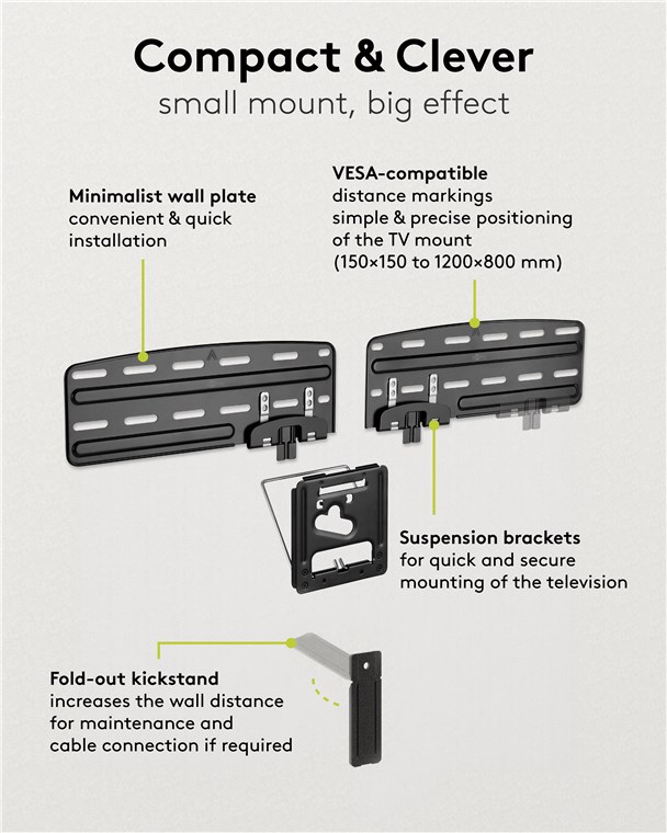 - Support TV ultraplat avec une distance au mur de seulement 7,5 mm, grâce auquel l'appareil affleure presque le mur et ne dépasse pas dans la pièce