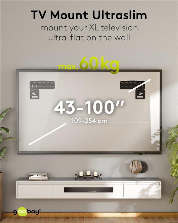 Une technologie invisible, un divertissement à couper le souffle : Le support mural ultraplat met en valeur ton téléviseur slim et lui donne toute l'attention qu'il mérite. Avec une distance au mur extrêmement réduite et une limite de charge de 60 kg, tu peux mettre en scène même les téléviseurs les plus lourds de manière efficace et ultraplate. Maintien sûr et lignes épurées pour un look moderne.
