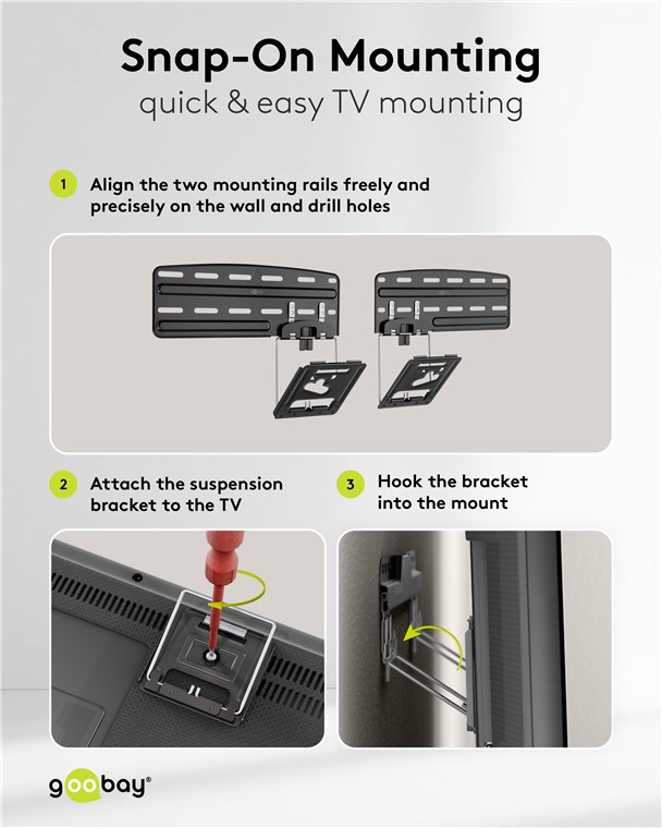 - Parfait pour les téléviseurs particulièrement grands et lourds jusqu'à 100 pouces (254 cm) et 60 kg, qui s'installent facilement et rapidement grâce à un système de fixation par encliquetage