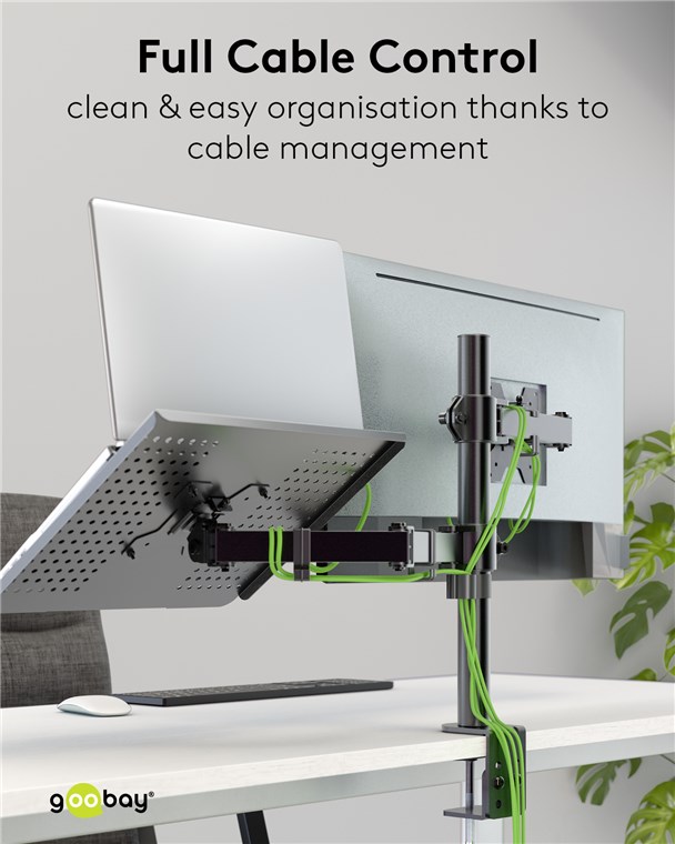 - Le système de gestion des câbles intégré au support d'écran protège les câbles de connexion et garantit un aspect épuré sans câbles lâches