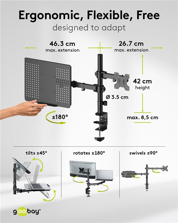 - Parfait pour le montage stable sur table d'un écran jusqu'à 10 kg et d'un ordinateur portable jusqu'à 4 kg, réglable en hauteur, pivotant à ±90° et inclinable à ±45°, rotation à ±180°, épaisseur de plateau recommandée : 10-85 mm