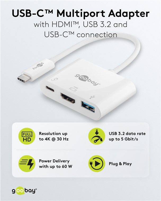 Adapter Multiport kieruje sygnały z USB-C™ do urządzeń HDMI™ i USB. Technologia USB Power Delivery umożliwia ładowanie urządzeń końcowych o napięciu do 60W. Pozwala to na łatwe ładowanie np. dużych notebooków, koncentratorów lub stacji dokujących. Dodatkowo z gniazdem USB A 3.0 do szybkiego przesyłania danych i ładowania z maksymalną prędkością do 5 Gbit/s. Obsługiwane są rezolucje do 4K*2k@30Hz.