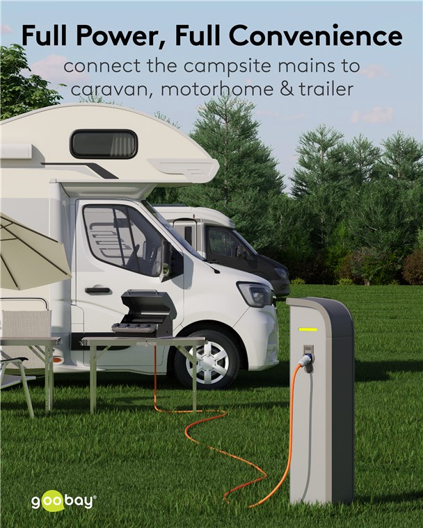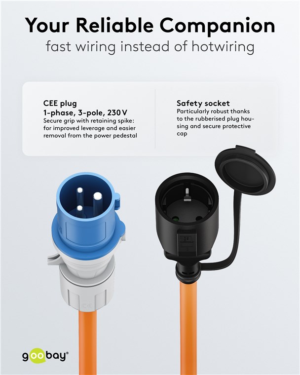 - Podstawowe akcesorium kempingowe: Adapter CEE do podłączania kamperów, przyczep kempingowych lub przyczep kempingowych do sieci elektrycznej na kempingu