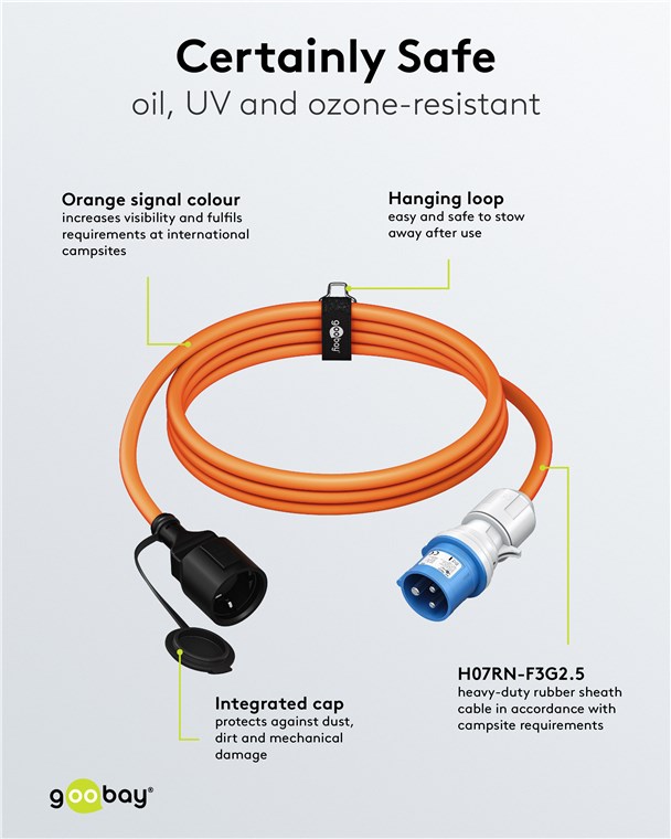 - Wytrzymały przewód gumowy H07RN-F 3G2.5 o przekroju 2,5 mm² wymagany na kempingach