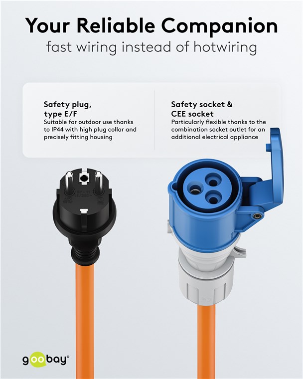 - W zależności od lokalnych wymogów bezpieczeństwa, może być również używany jako adapter CEE do kamperów, przyczep kempingowych lub na polu namiotowym