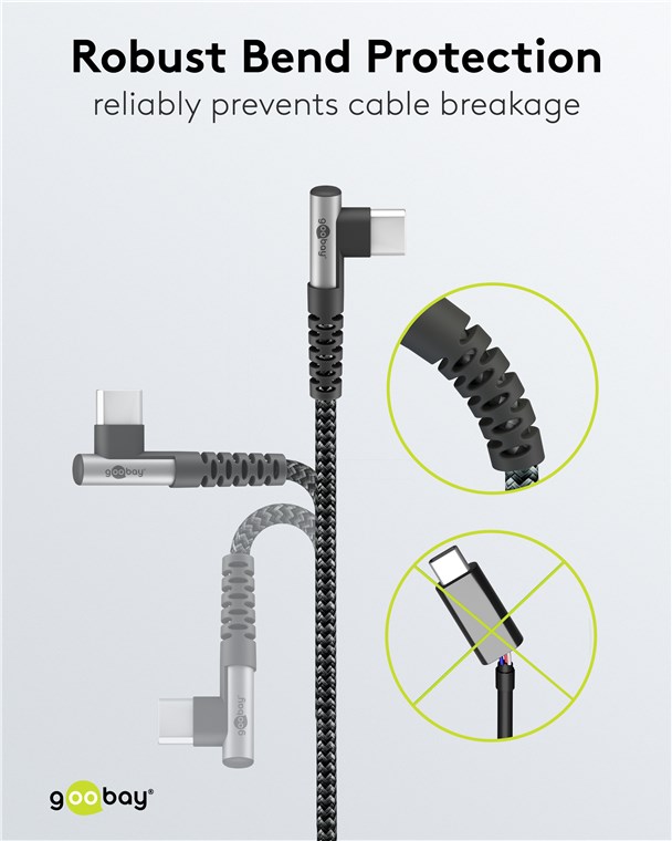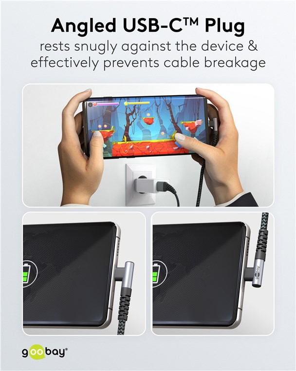 - Wtyczka dzięki kątowi ściśle przylega do urządzenia i w ten sposób skutecznie zapobiega zerwaniu kabla - zwłaszcza podczas jednoczesnego korzystania i ładowania urządzenia