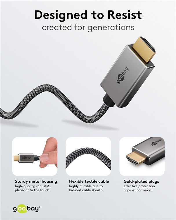 - Dzięki przepustowości do 18 Gbit/s, kabel HDMI™ zapewnia błyskawiczną transmisję danych, np. do strumieniowania HD ze smartfonów, notebooków, tabletów i innych urządzeń USB-C™