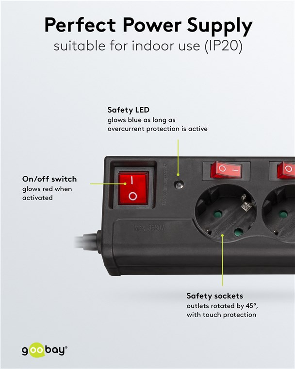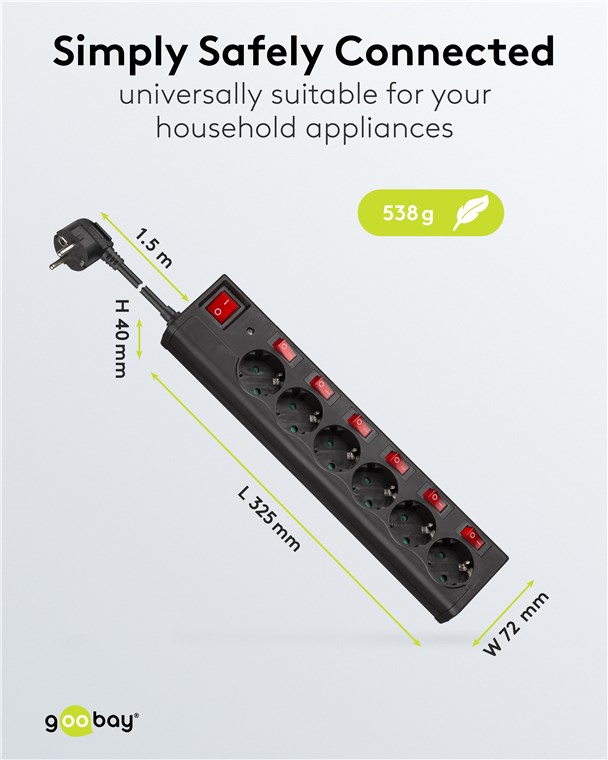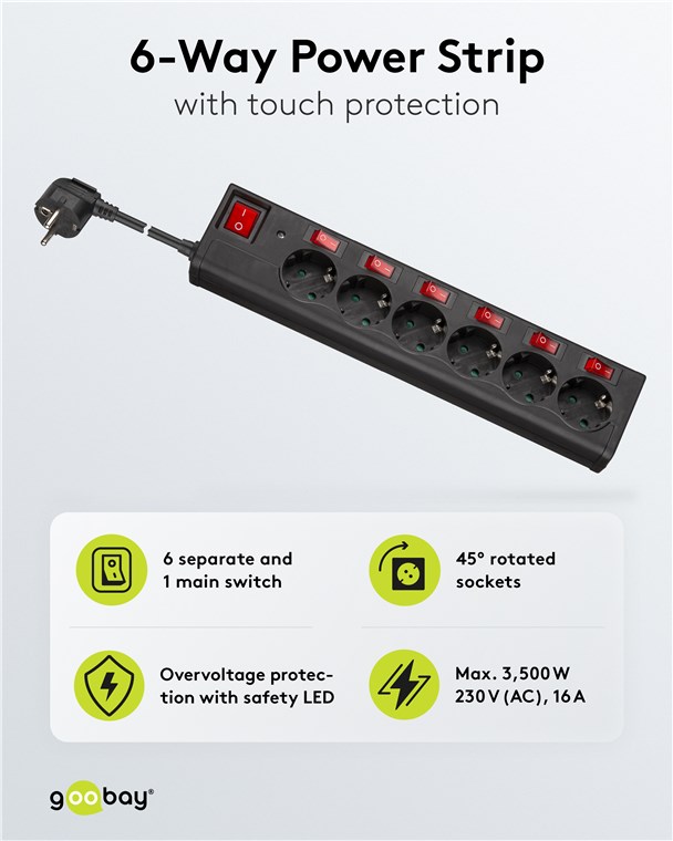 - Gniazdo wielokrotne z oddzielnymi, podświetlanymi wyłącznikami dla każdego z 6 gniazd oraz dodatkowym wyłącznikiem głównym dla całej listwy