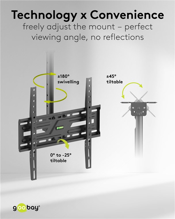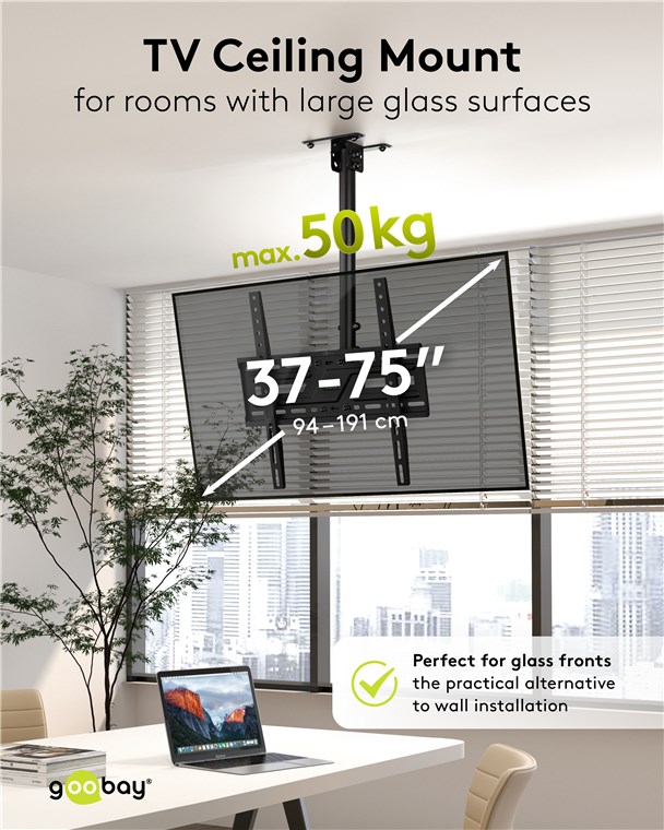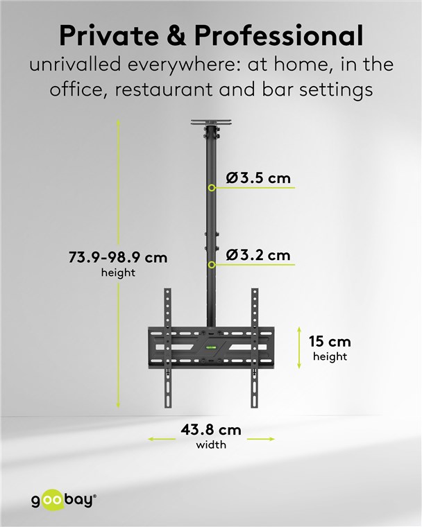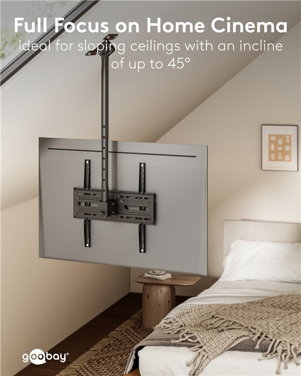 Kiedy ten uchwyt jest idealnym rozwiązaniem? Jeśli chcesz zamontować telewizor na skośnym lub zwykłym suficie. Dzięki teleskopowemu ramieniu i płynnie regulowanym przegubom możesz bardzo elastycznie ustawić kąt widzenia. Uchwyt telewizyjny sprawdza się również w pomieszczeniach z przeszklonymi ścianami: W pomieszczeniach komercyjnych, takich jak biura, bistro lub siłownie, telewizor można po prostu umieścić na suficie – aby uzyskać optymalny kąt widzenia niezależnie od miejsca w pomieszczeniu. Aby w pełni skupić się na tym, co najważniejsze.