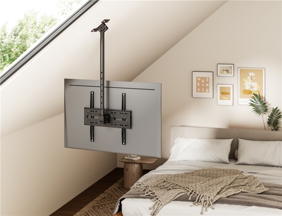 - Uchwyt telewizyjny do montażu na skośnych lub zwykłych sufitach: Szczególnie praktyczny, gdy nie ma ściany do zamocowania, np. w pomieszczeniach z przeszklonymi fasadami
