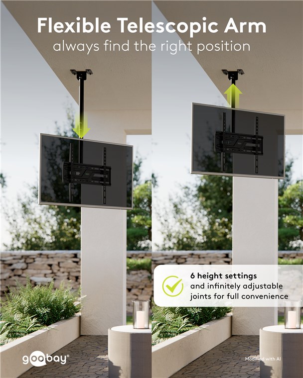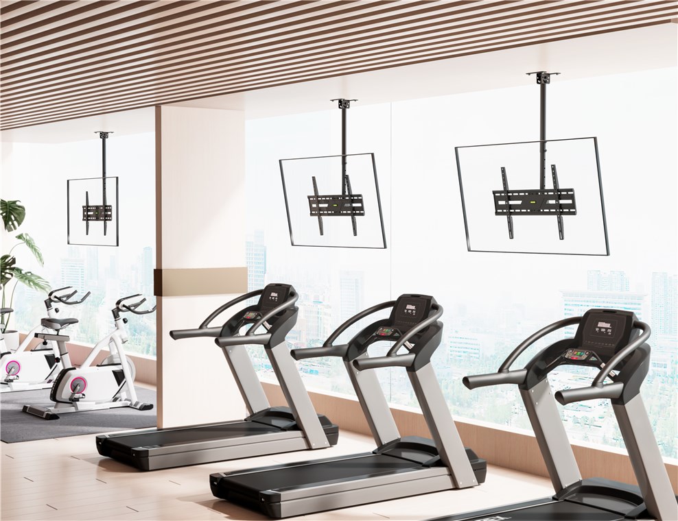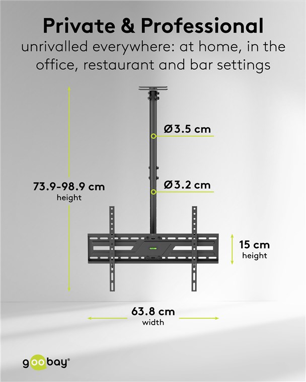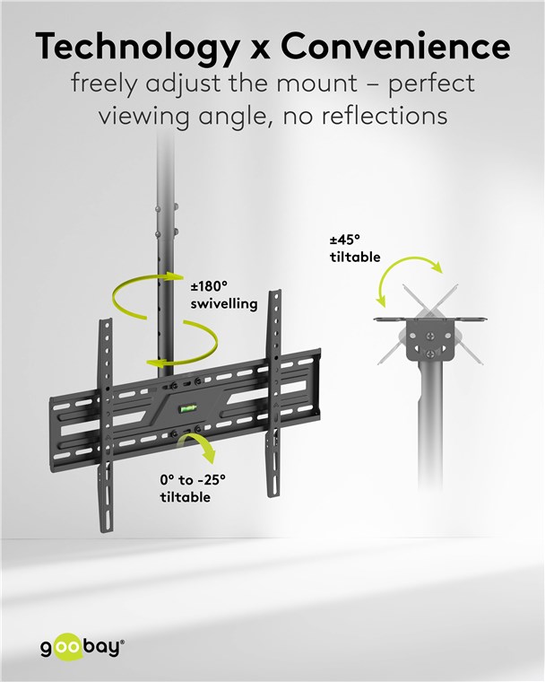 Kiedy ten uchwyt jest idealnym rozwiązaniem? Jeśli chcesz zamontować telewizor na skośnym lub zwykłym suficie. Dzięki teleskopowemu ramieniu i płynnie regulowanym przegubom możesz bardzo elastycznie ustawić kąt widzenia. Uchwyt telewizyjny sprawdza się również w pomieszczeniach z przeszklonymi ścianami: W pomieszczeniach komercyjnych, takich jak biura, bistro lub siłownie, telewizor można po prostu umieścić na suficie – aby uzyskać optymalny kąt widzenia niezależnie od miejsca w pomieszczeniu. Aby w pełni skupić się na tym, co najważniejsze.