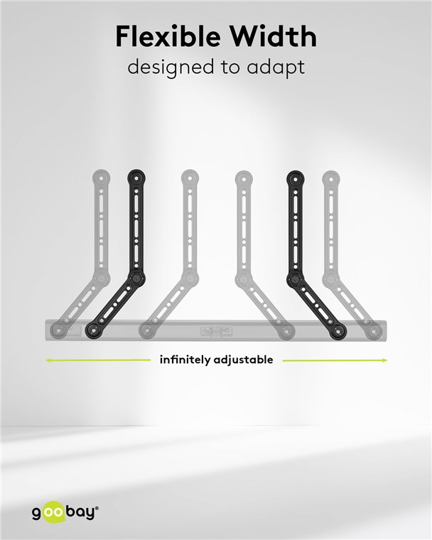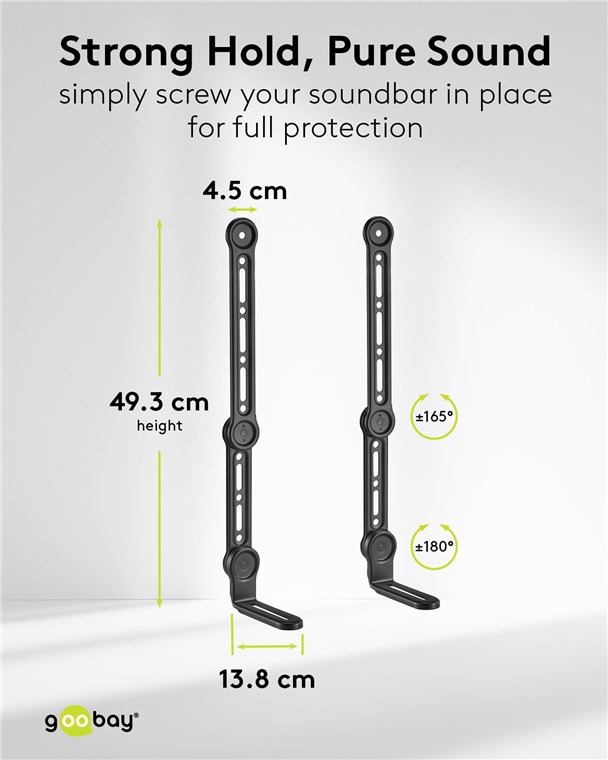 - Szerokość nóżek podstawy soundbara można regulować w sposób płynny, dzięki czemu pasuje ona do większości soundbarów popularnych producentów, np. Samsung, LG, Sonos, Sennheiser, Teufel lub JBL